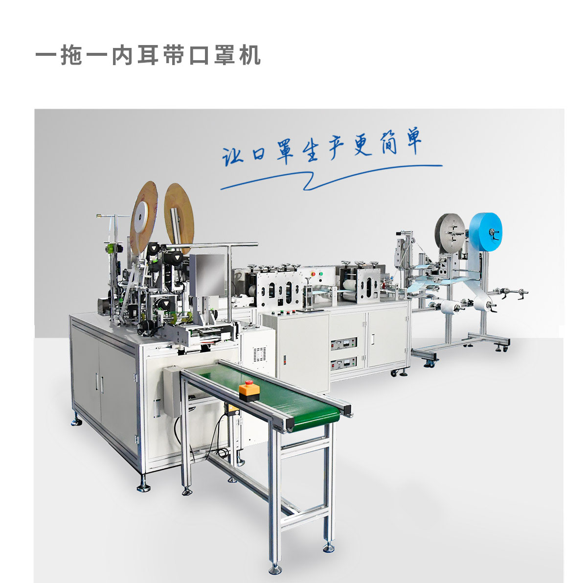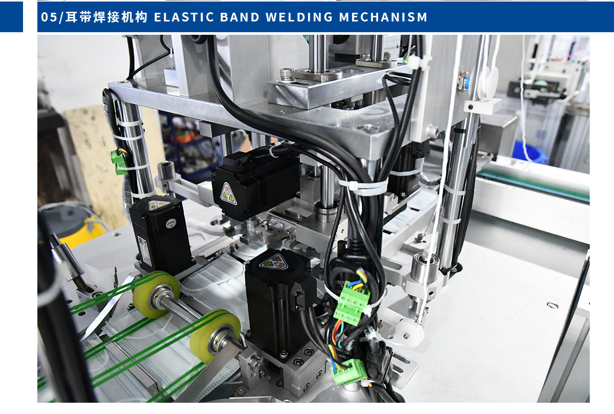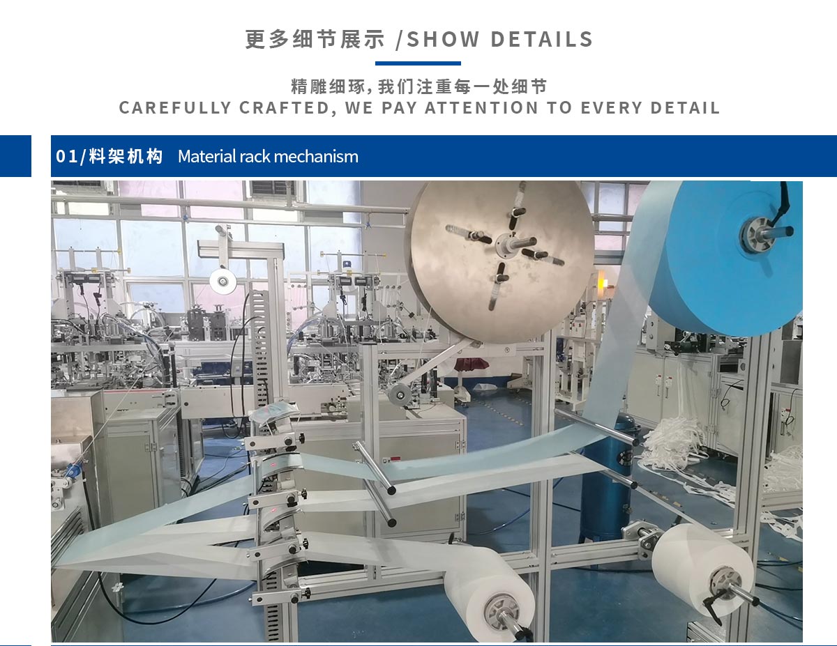 本机台是一台全自动化生产平面口罩的机器,由1台本体加1台耳带机组成。从口罩本体生产到耳带熔接,鼻线熔接直至出成品 ,都是自动化,不需人工操作。适用于内耳带口罩生产。