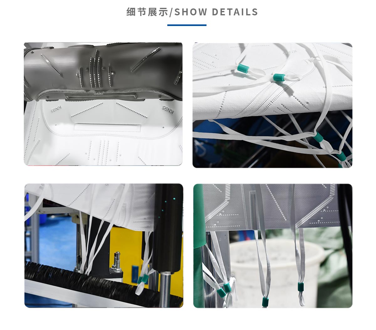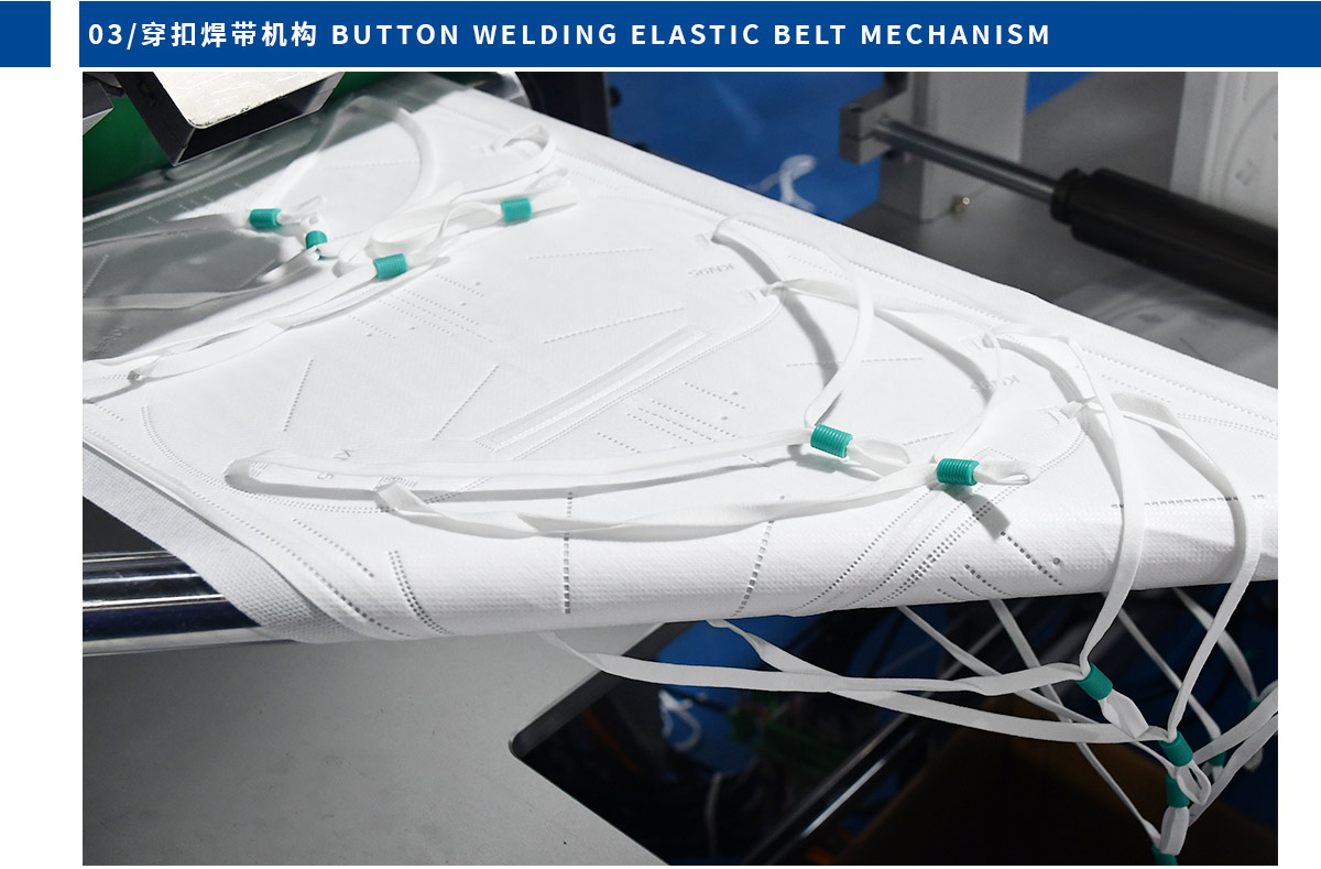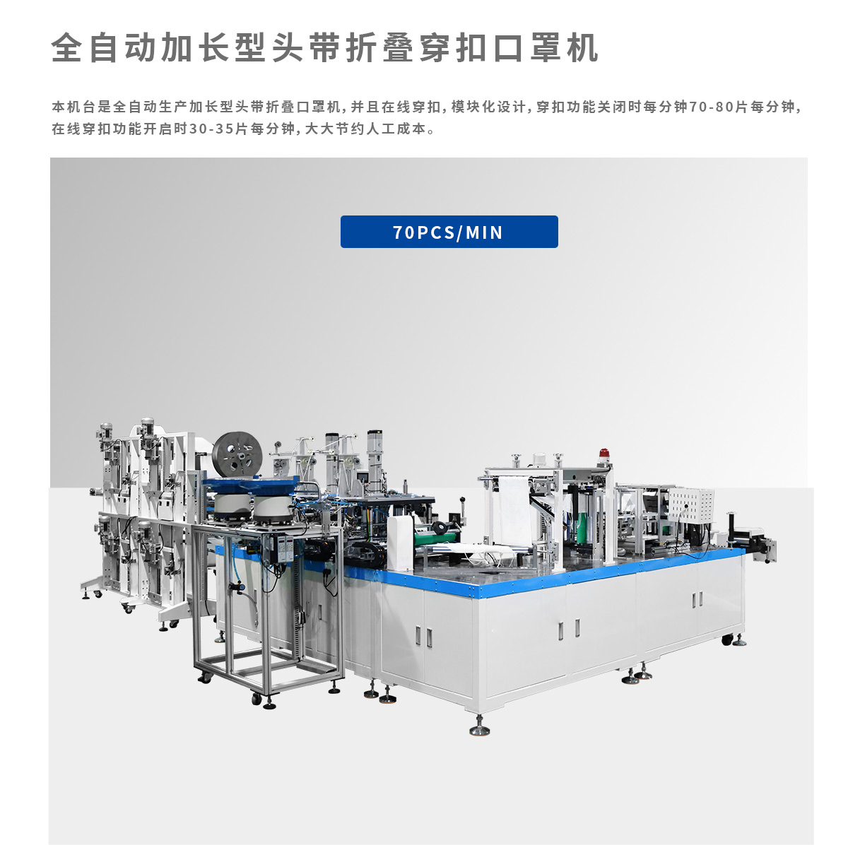 本机台是全自动生产加长型头带折叠口罩机,并且在线穿扣,模块化设计,穿扣功能关闭时每分钟60-80片在线穿扣功能开启时每分钟70片,节省人工成本