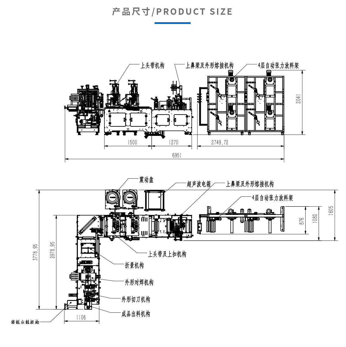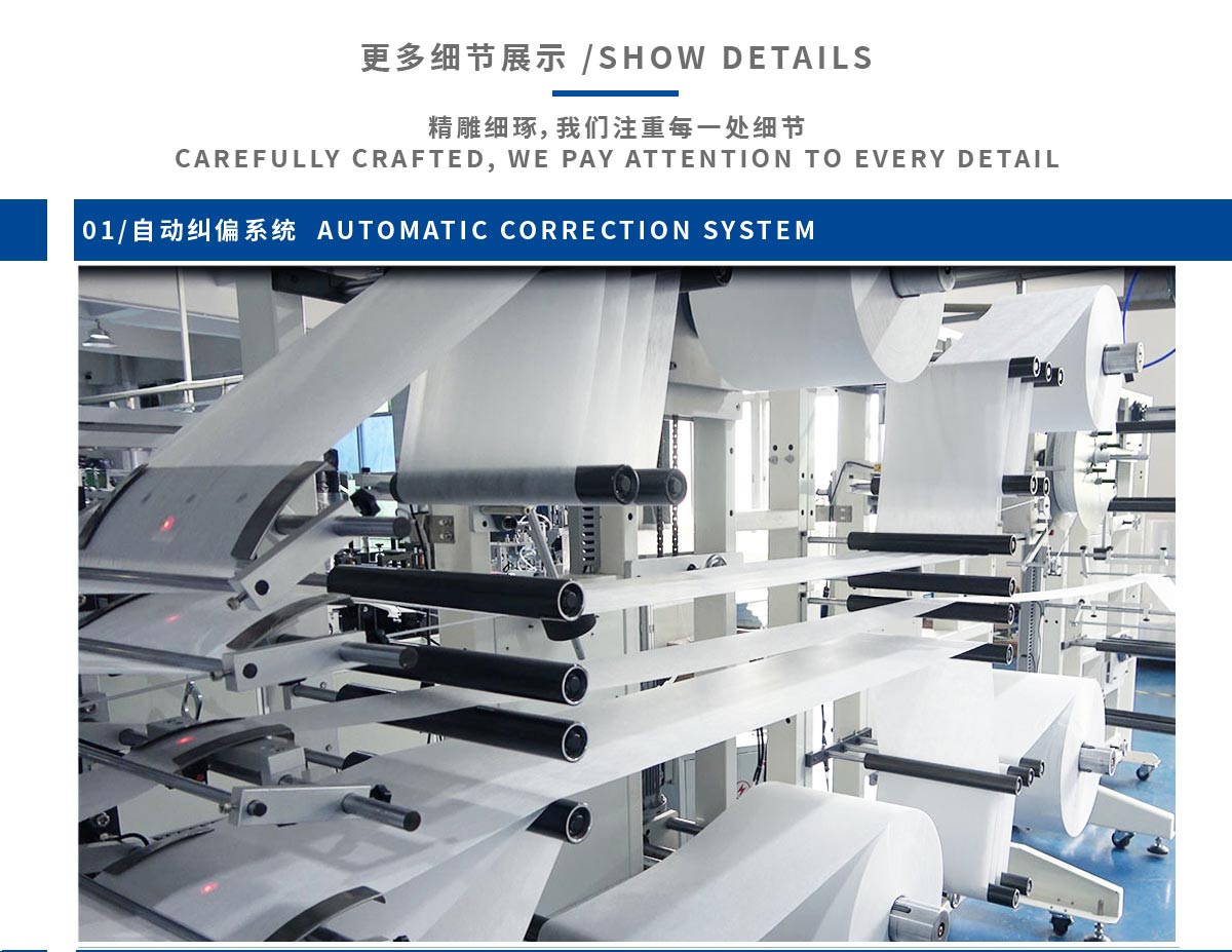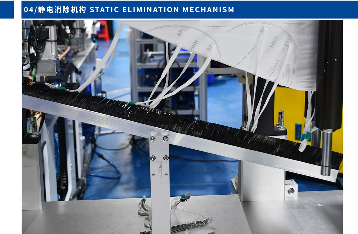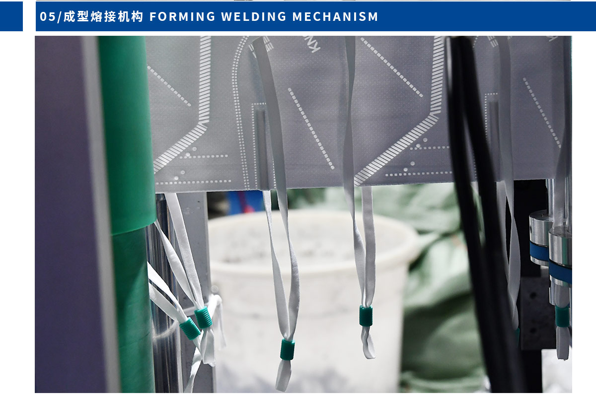 本机台是全自动生产加长型头带折叠口罩机,并且在线穿扣,模块化设计,穿扣功能关闭时每分钟60-80片在线穿扣功能开启时每分钟70片,节省人工成本