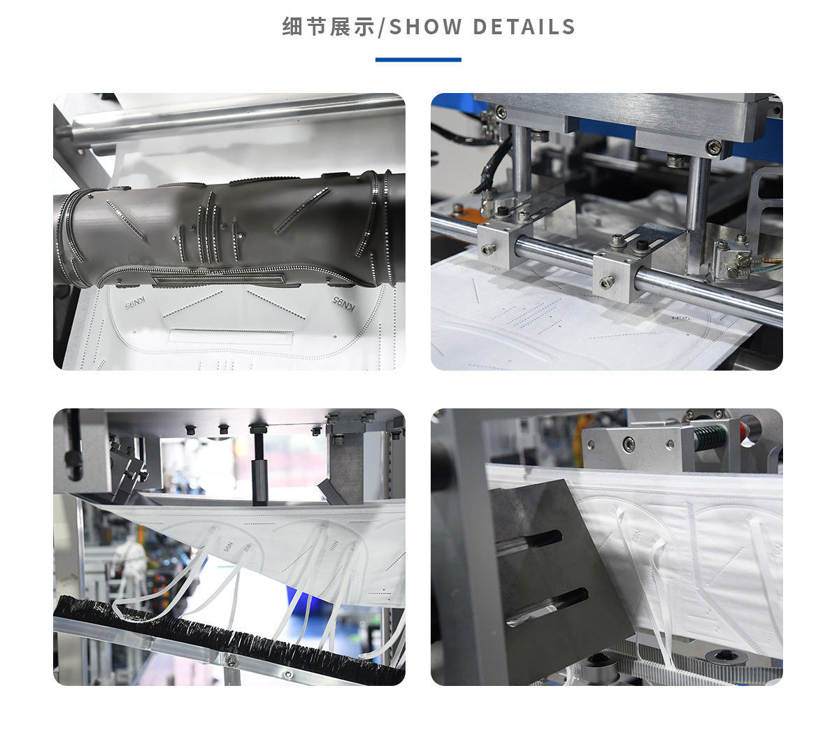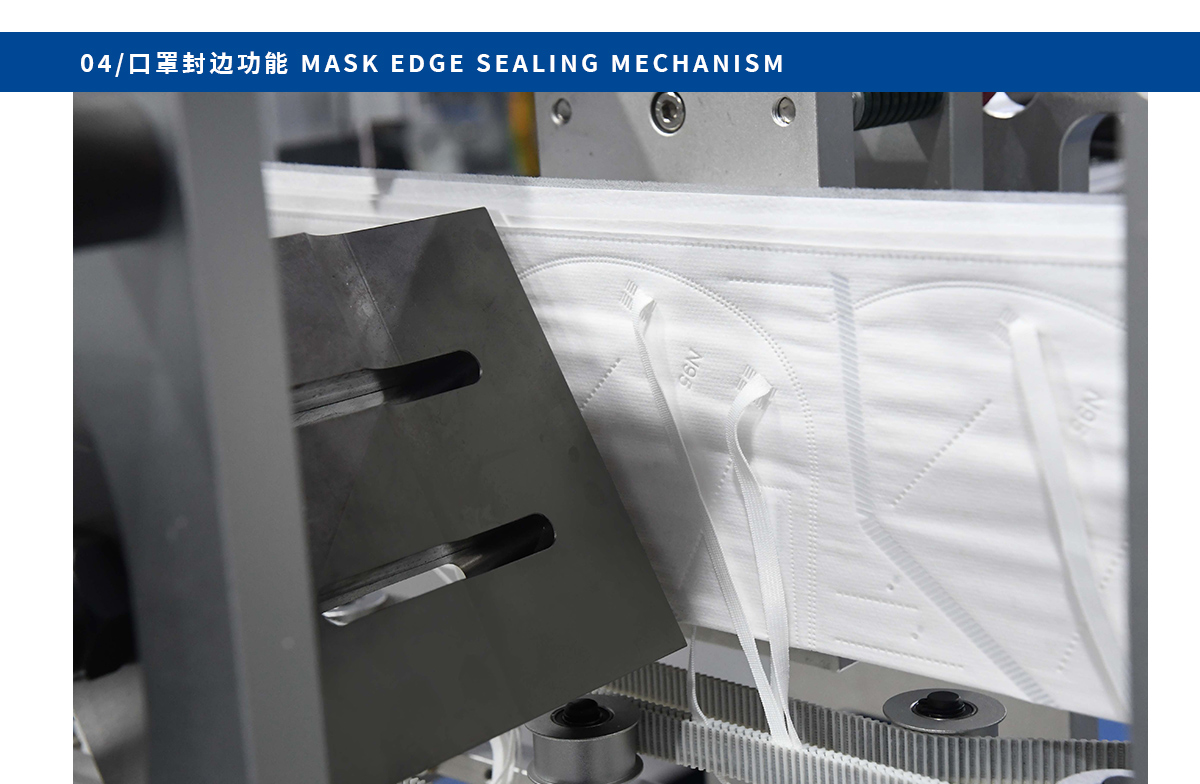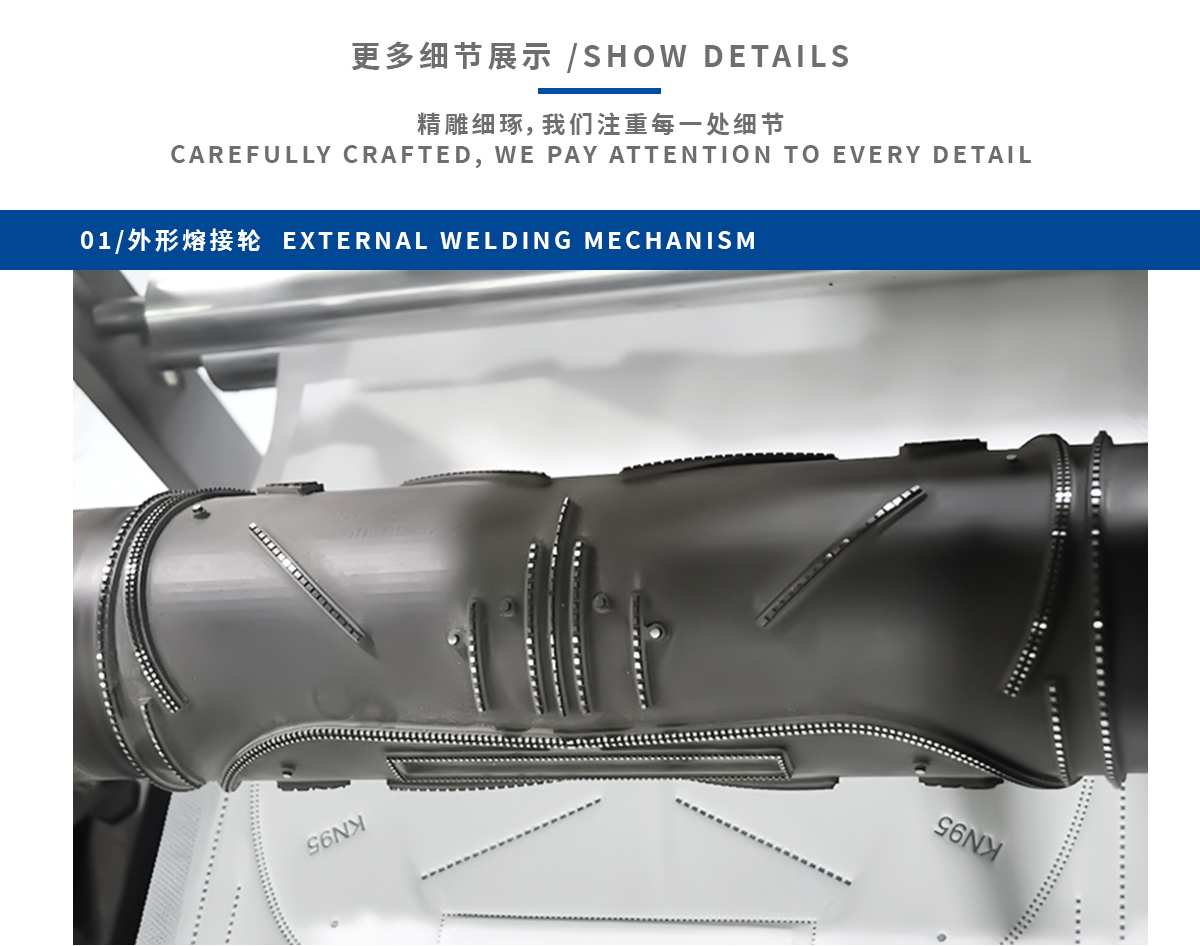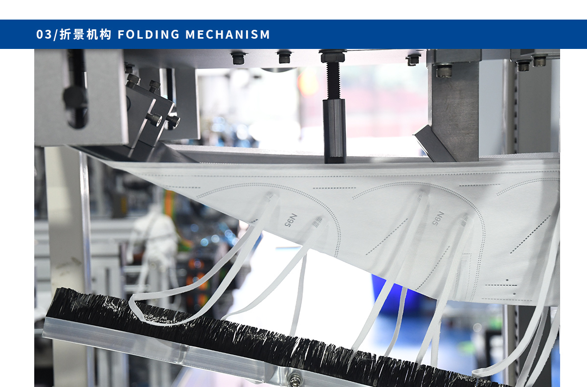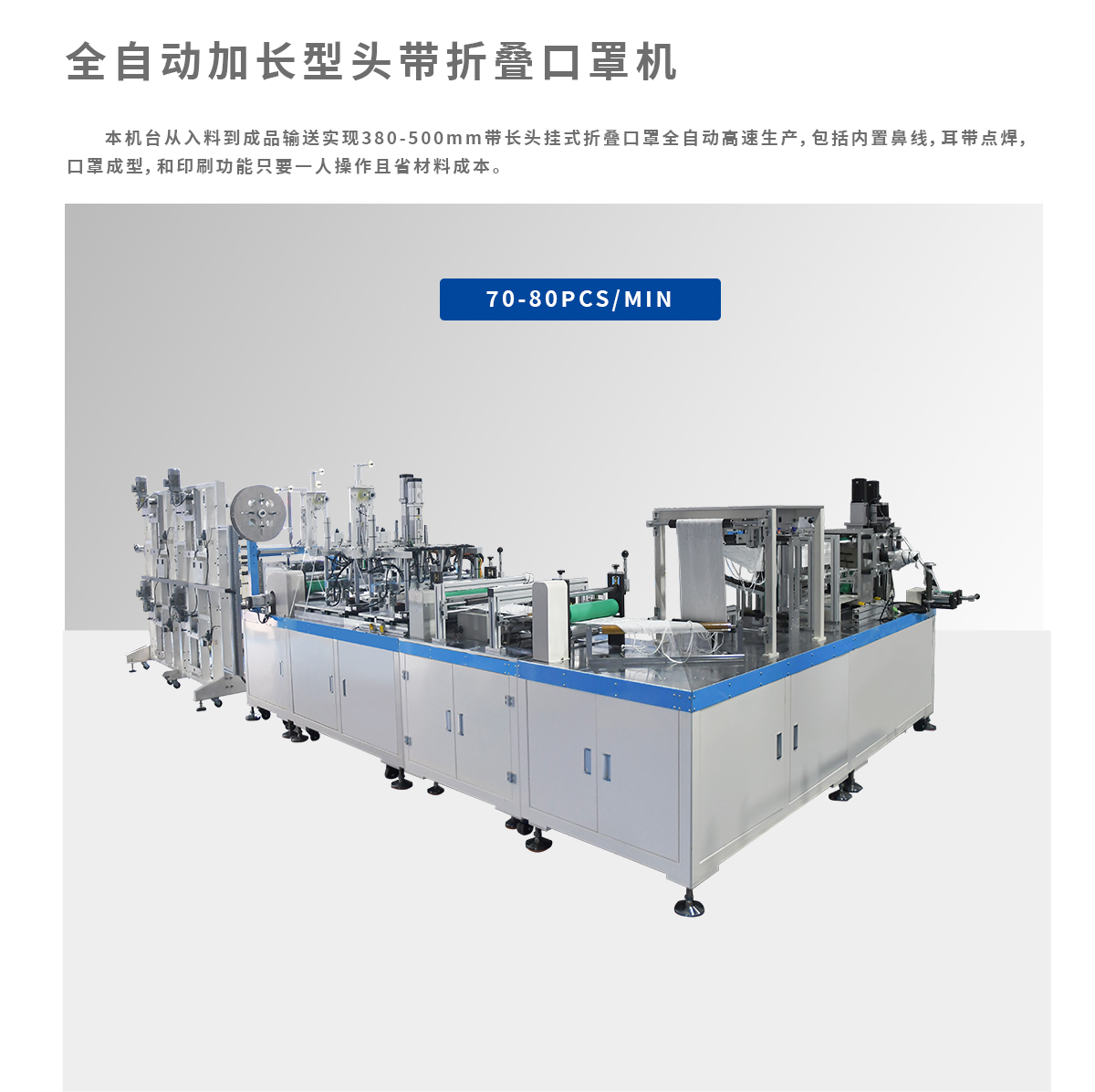 本机台从入料到成品输送实现380-500mm带长头挂式折叠口罩全自动高速生产,包括内置鼻线,耳带点焊,口罩成型,和印刷功能只要一人操作且省材料成本。