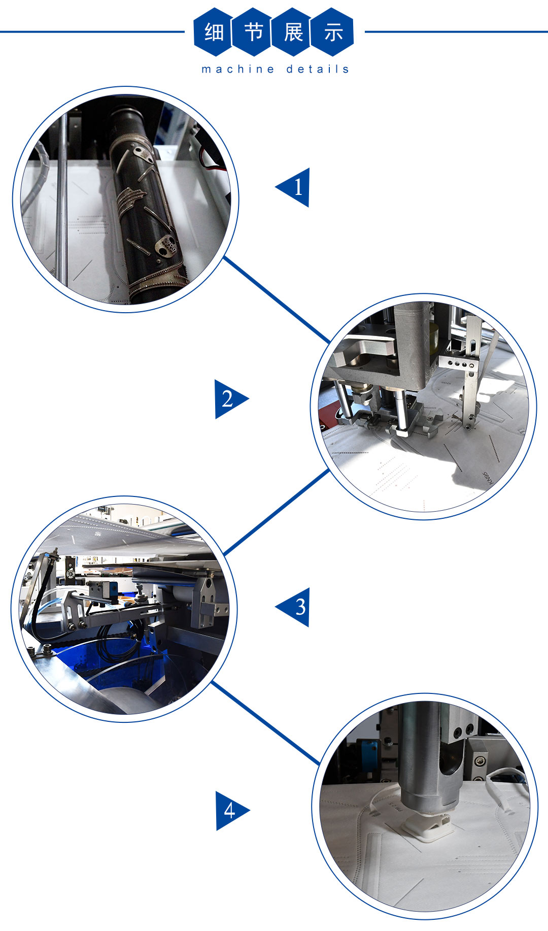 本机台是一台全自动化折叠耳挂式带海绵条焊阀口罩生产设备,从口罩本体生产到耳带熔接,鼻线熔接,自动贴海棉条,直至出成品,都是自动化,仅需一人操作。PLC微电脑控制,稳定性高。