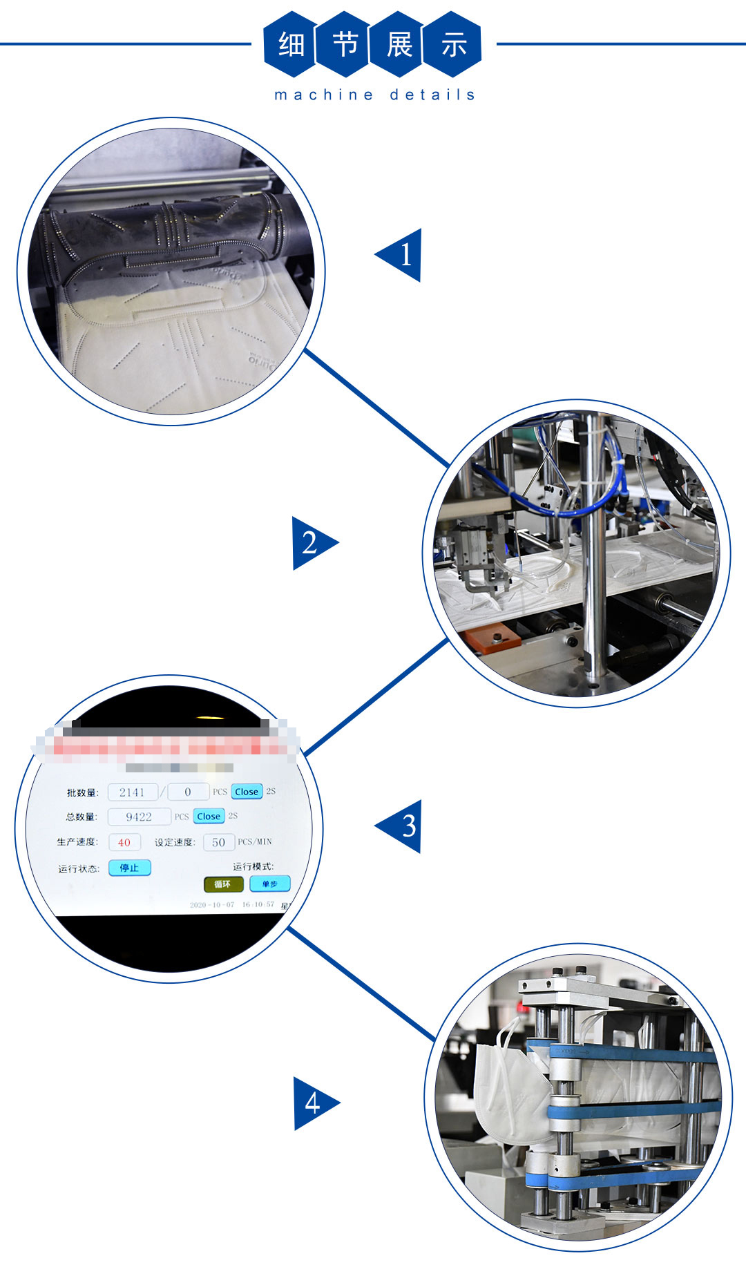 本机台是一台全自动化折叠头挂式口罩生产设备,从口罩本体生产到头带熔接,鼻线熔接直至出成品,都是自动化,PLC微电脑控制,稳定性高。