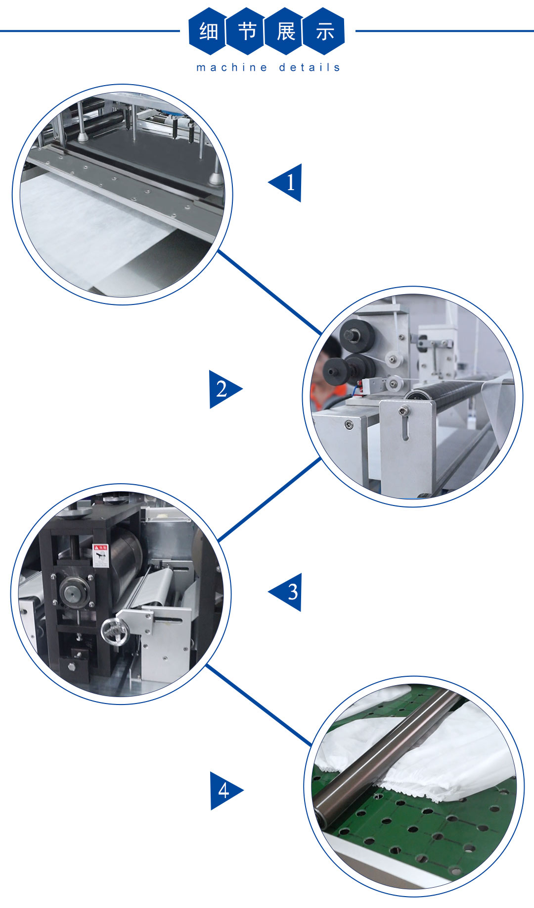 本机采用超声波焊接方式将无纺布一次熔接成型为三角裤,可分为单片型及加贴型两种机型。人机界面操作只要一人,内置 PLC程序控制,故障率低。减速刹车马达,减少了产品的不良率。美观的铝合机架,在更换模具的情况下 可生产不同规格的三角裤。