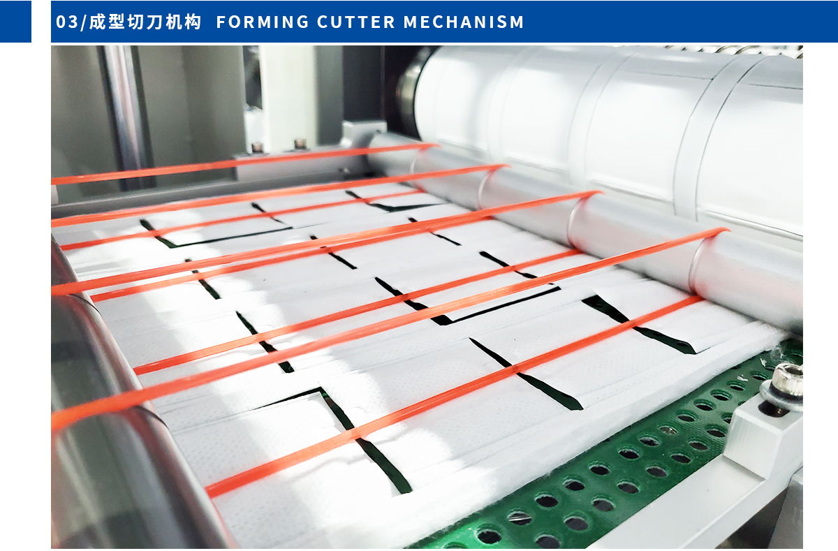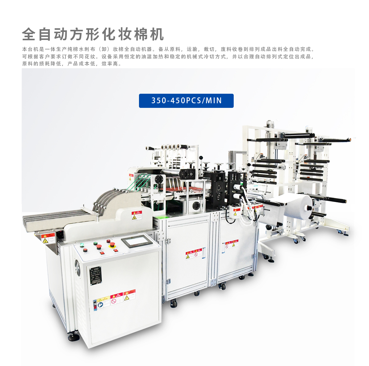 本台机是一体产业生产纯棉水刺布(卸)妆棉的全自动机器。备从原料,运输,裁切,废料收卷到排列成品出料全自动完成。可根据客户要求订做不同花纹。设备采用最恒定的油温加热和最稳定的机械式冷切方式,并以最合理的自动排列式定位排出成品,是原料的损耗降至最低,产品成本低,效率高。