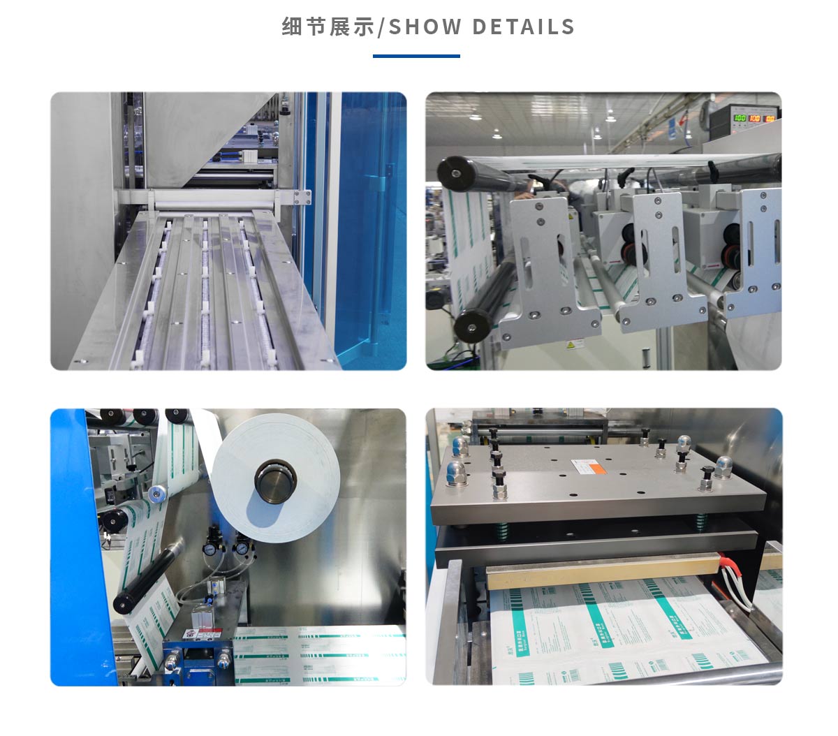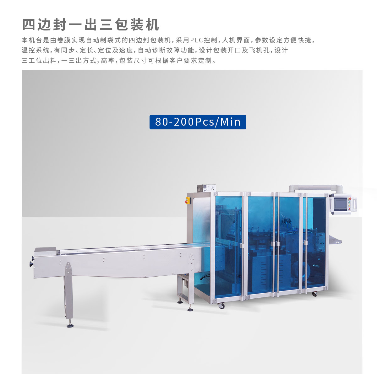 本机台是由卷膜实现自动制袋式的四边封包装机,采用PLC控制,人机界面,参数设定方便快捷,温控系统,有同步、定长、定位及速度,自动诊断故障功能,设计包装开口及飞机孔,设计三工位出料,一三出方式,高率,包装尺寸可根据客户要求定制。