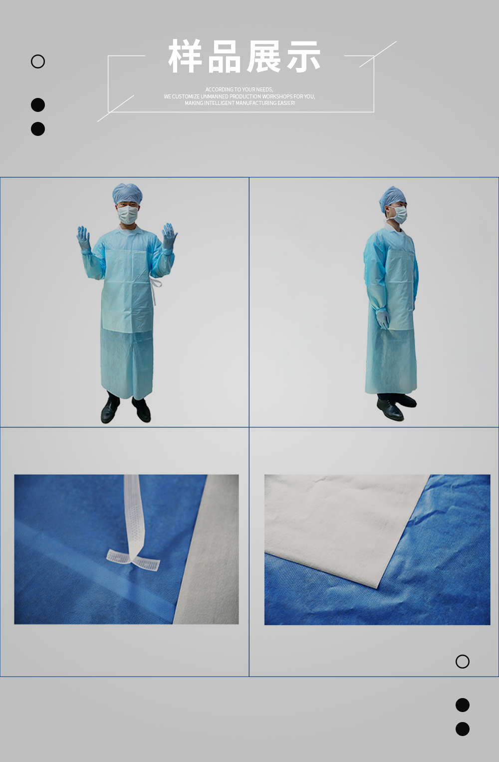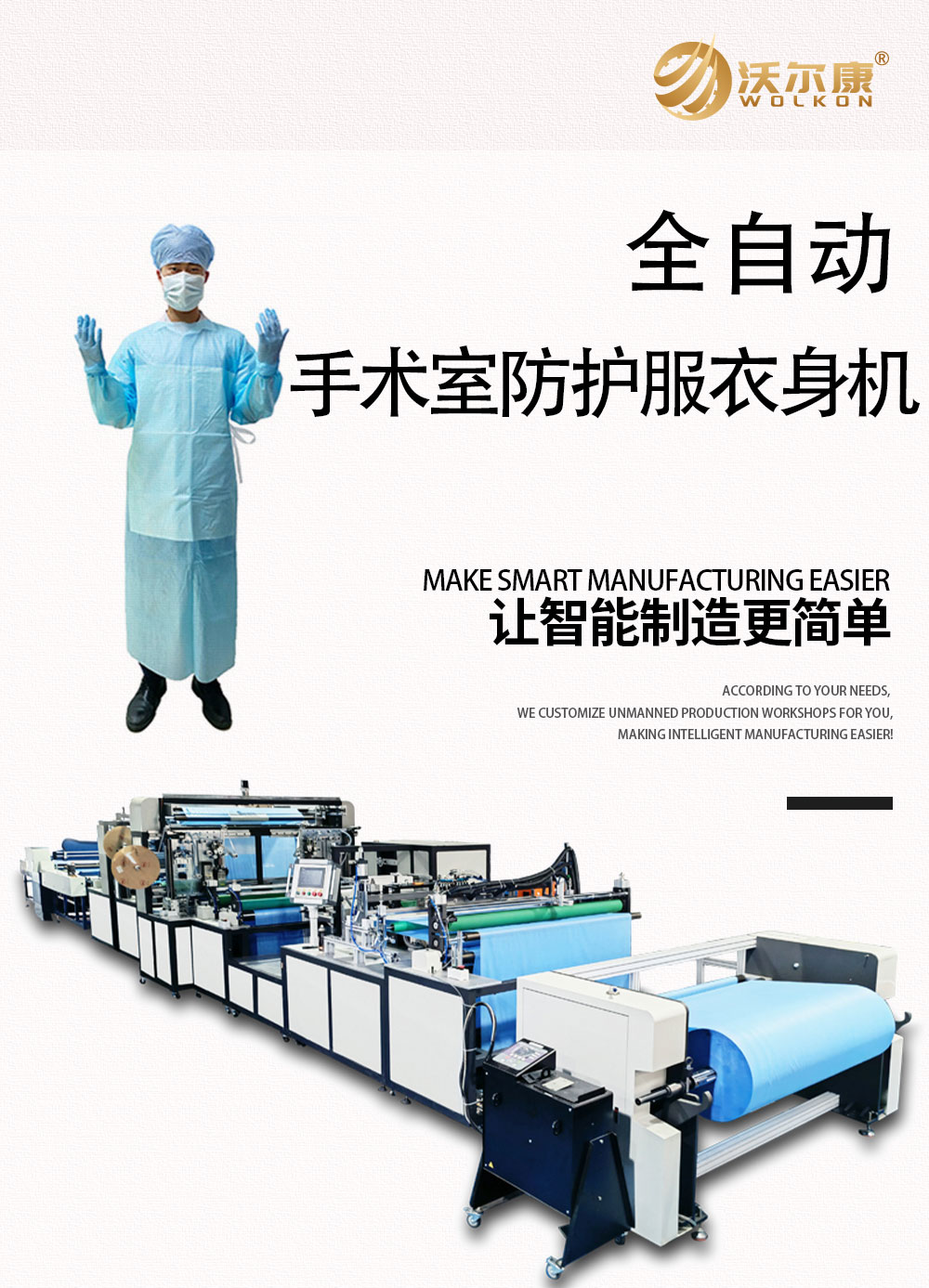 全自动防护服衣身制造机,是一台全自动生产无纺布一次性医疗用防护服衣身制造设备,从布料入料到腰带自动点焊、自动切领口、自动对折,自动切袖口、自动肩部熔接、自动成型切断等全自动化一体完成。中间不需要手工操作,一台机器只要一个人工操作,同时自动钉扣功能可选择性开启,实现一机两用,两款产品,实现了机器代替大部分人工传统工序。