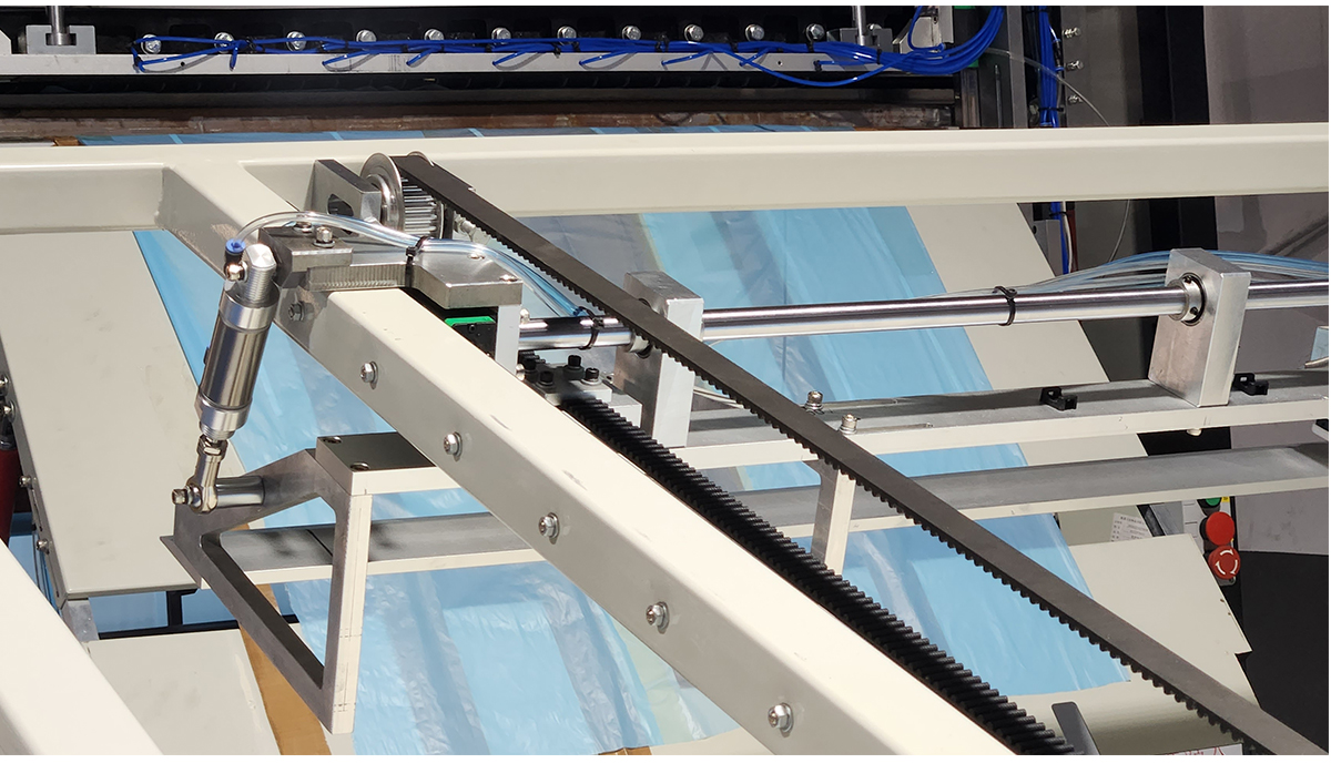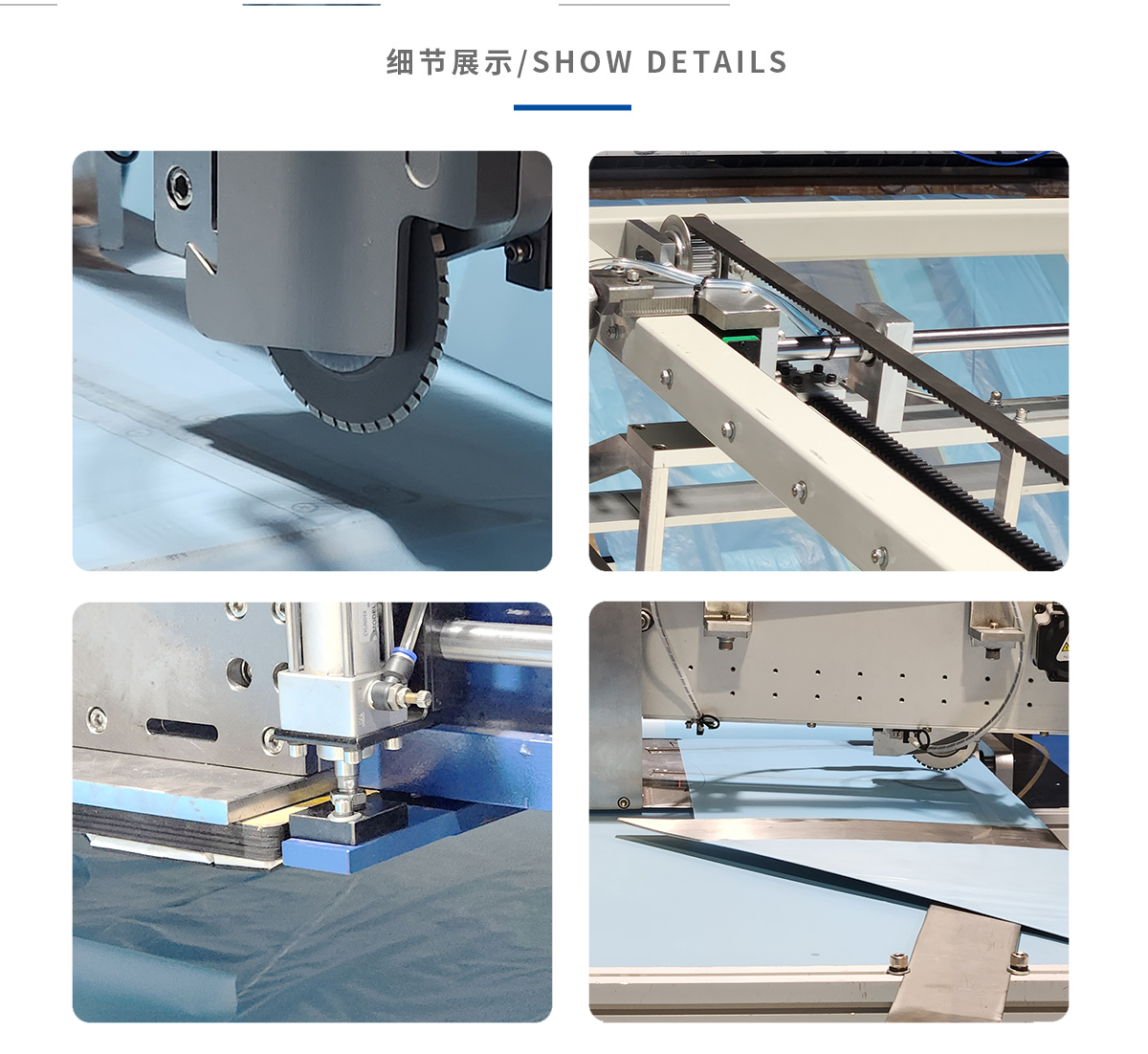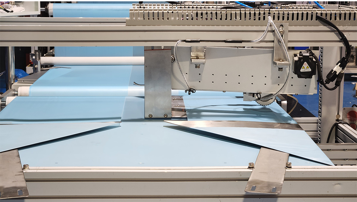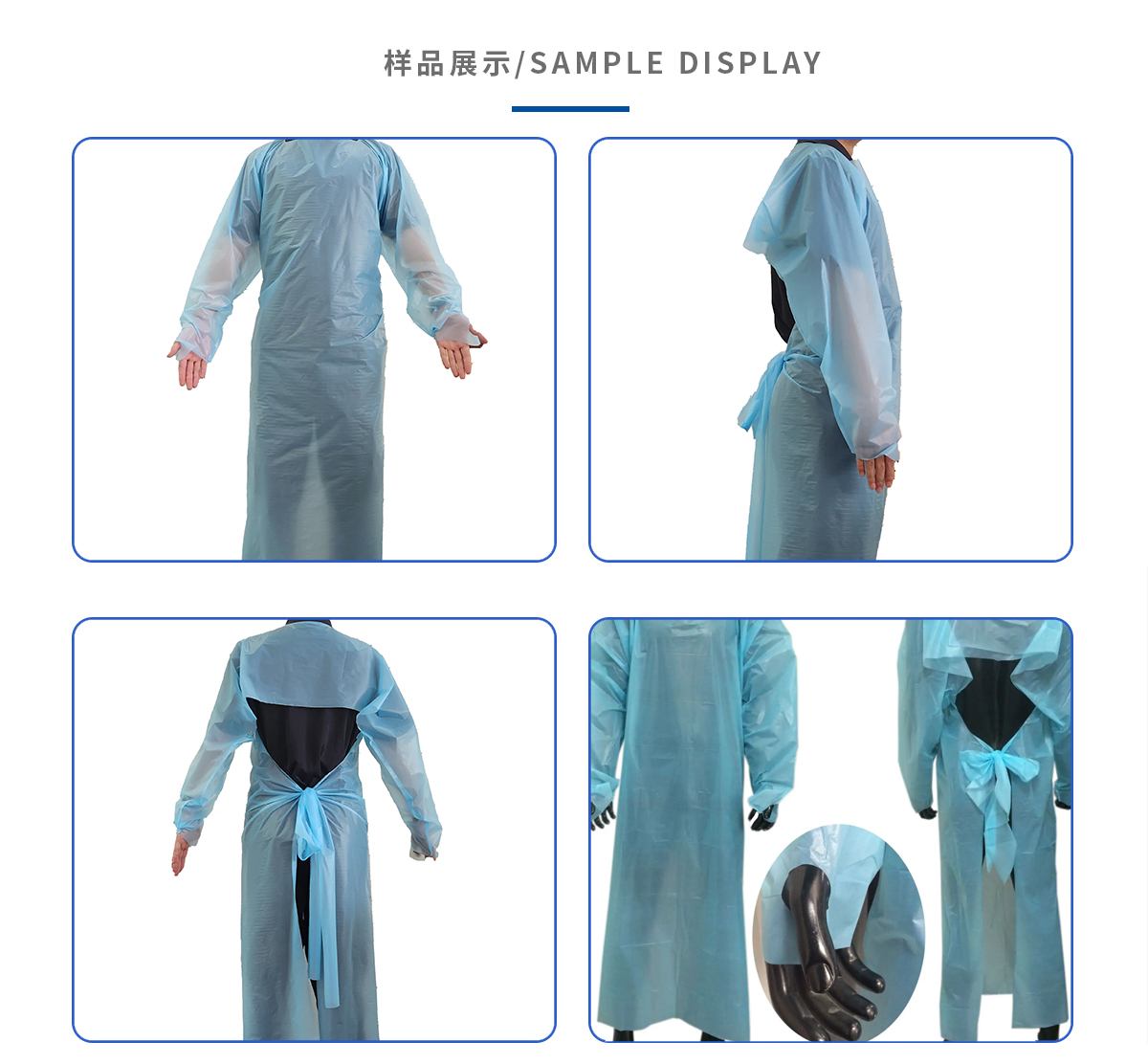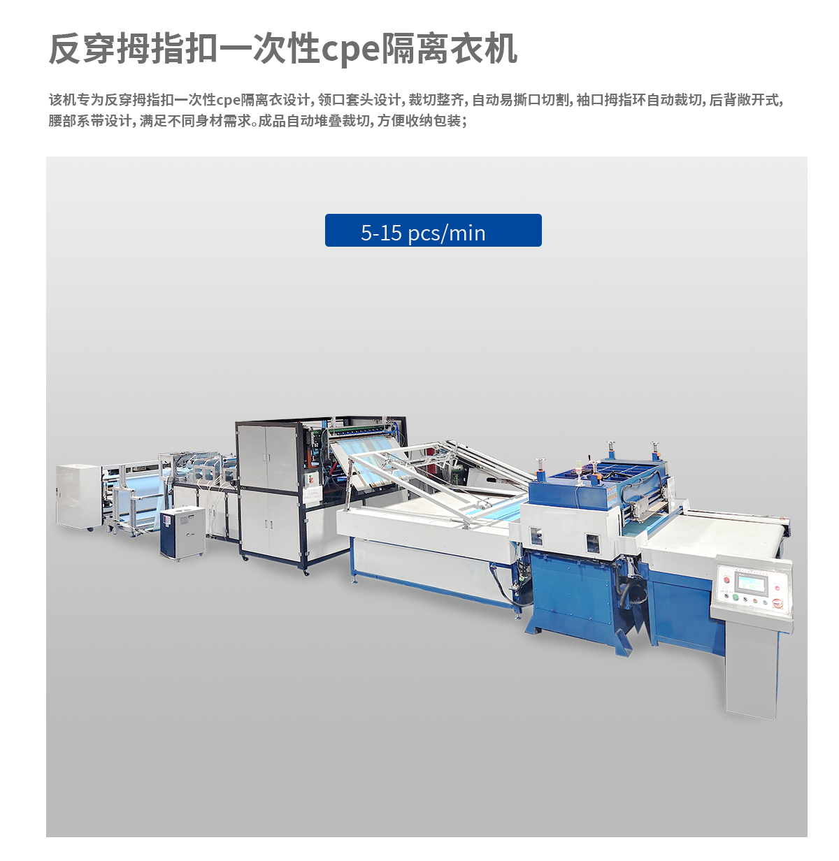该机专为反穿拇指扣一次性cpe隔离衣设计,领口套头设计,裁切整齐,自动易撕口切割,袖口拇指环自动裁切,后背敞开式,腰部系带设计,满足不同身材需求。成品自动堆叠裁切,方便收纳包装;